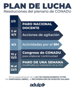 La semana previa al paro será clave para definir la evolución del conflicto. Las actividades previstas para los primeros días de marzo, junto con el congreso nacional de CONADU, marcarán el rumbo del plan de lucha.